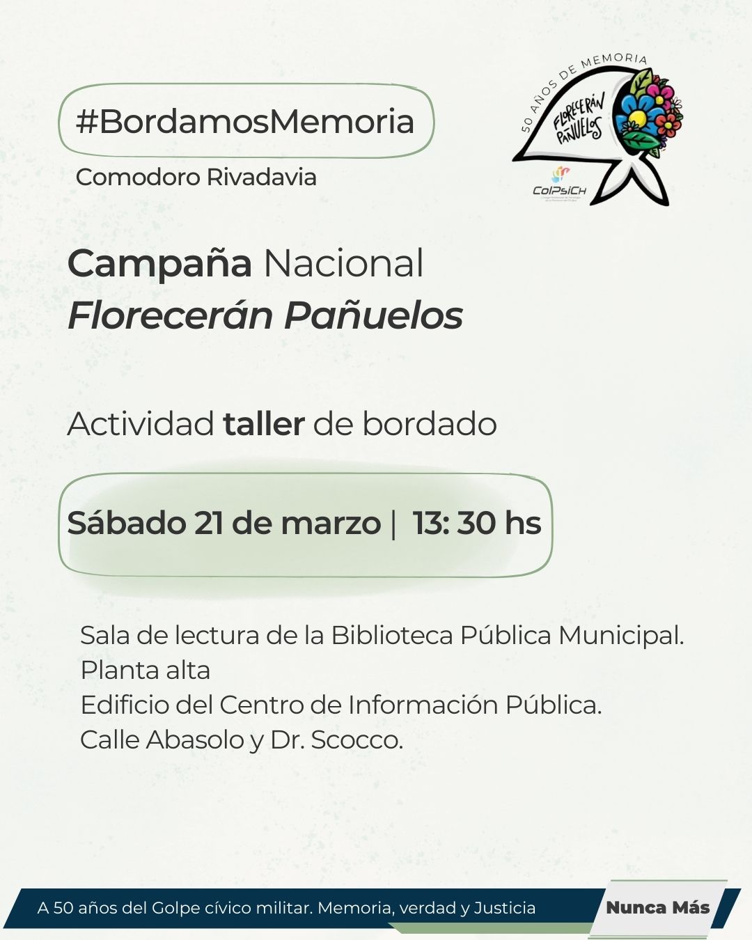 En el marco de una nueva conmemoración del Golpe de Estado en Argentina de 1976 y a 50 años de aquel hecho, el Colegio Profesional de Psicólogas y Psicólogos de Chubut invita a la comunidad de Comodoro Rivadavia a participar de un taller de bordado abierto y gratuito.